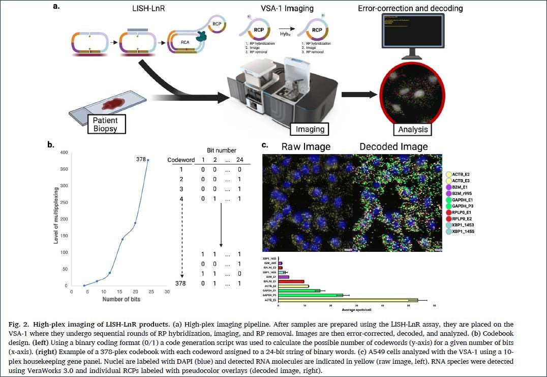 Unmet Need Traditional gene expression methods that use bulk RNA analysis lack the ability to resolve transcript location, and thus fail to capture the inherent cellular heterogeneity present in virtually every tissue. Abundance and localization of RNA transcripts mapped to specific regions of tissue can complement histological analysis, providing an additional layer of molecular information. Subcellular resolution of mRNA abundance and location can in some cases be used to categorize biologically important cell-to-cell variability and interactions. Technology Overview The field of in situ spatial biology is revolutionizing our understanding of tissue architecture, disease processes and immune responses. The LISH technology described above has been further developed into LISH-Lock'n'Roll (LISH-LnR), a multiplexed probe ligation technology that uses bipartite probe sets and rolling circle amplification for RNA detection in situ, which enables detection and discrimination of even highly similar RNA sequences with subcellular resolution. LISH-LnR allows for cost-effective, simultaneous detection of a large number of RNA sequences with improved specificity and sensitivity, overcoming many limitations of existing methods. Additionally, Dr. Larman has developed a system of “molecular rheostats” that tune the LISH-LnR assay performance, a complementary sequencing-based assay for probe panel qualification (using LISH-seq C13639), and a QC method to determine the quality and availability of fixed tissue RNA (using LISH-QC C13639). The LISH-LnR work is described in a new publication. The associated patent application can be found here. A patent application covering an improved version of the LISH-LnR technology has also been filed here.